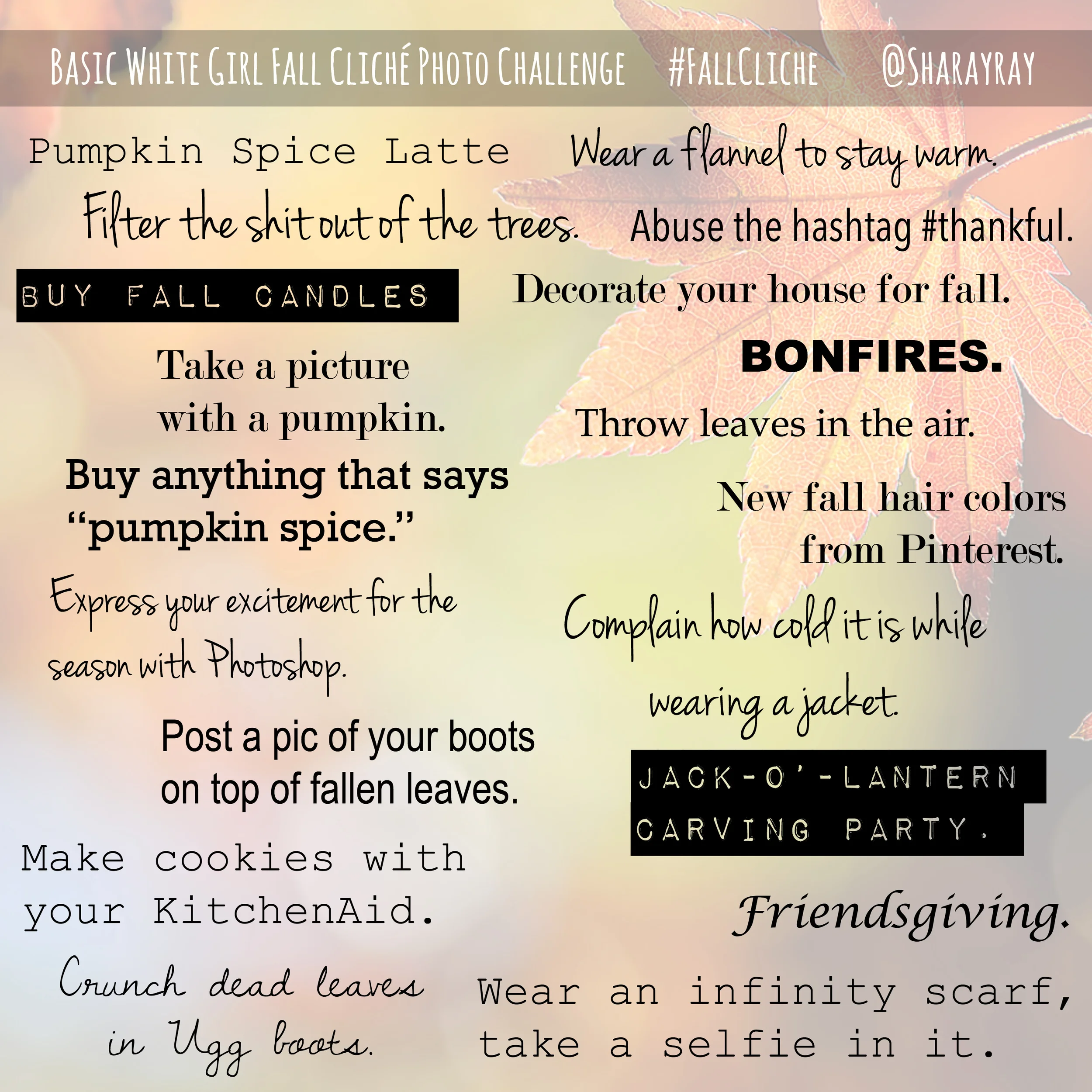 I decided to do most of the things on this list, because.. I love a good challenge. I did modify it a bit to make sense for an Instagram photo challenge. Please share the list via Instagram and take part in the Fall Cliche Photo Challenge with me.. Of course, make sure to hashtag your photo with #FallCliche, and any other fall hashtags. :)